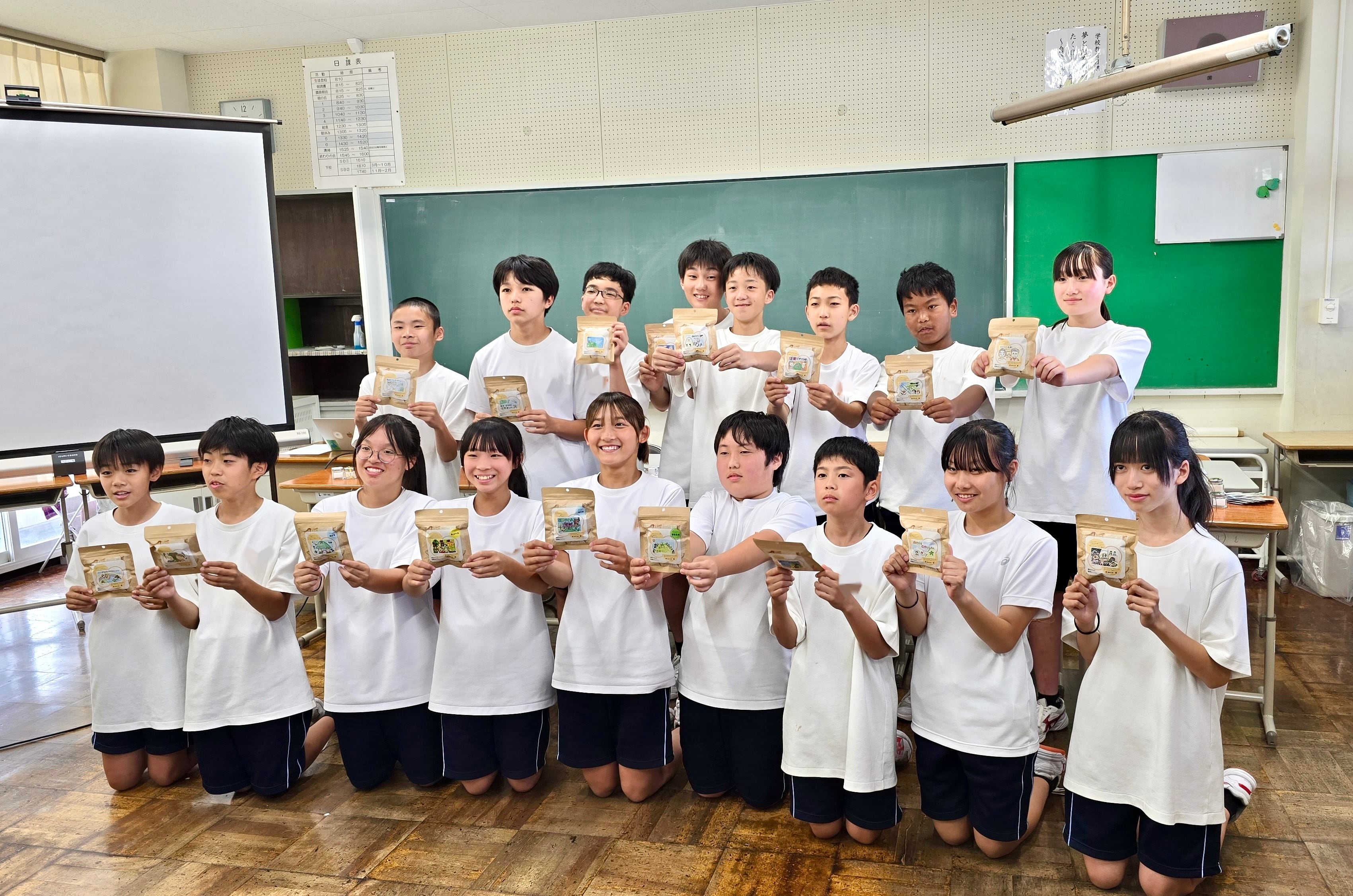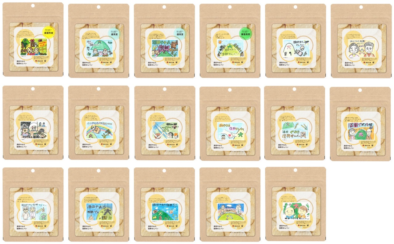 パッケージは八幡小学校 令和6年度 卒業生17人(令和7年度 鳥海八幡中学校1年生)の絵とイラストを使用し、17パターンのデザインがございます。子どもたちの思いが復興への願いとして込められています。この全17種類をセットで、特注のオリジナル段ボールに入れてお送りいたします。