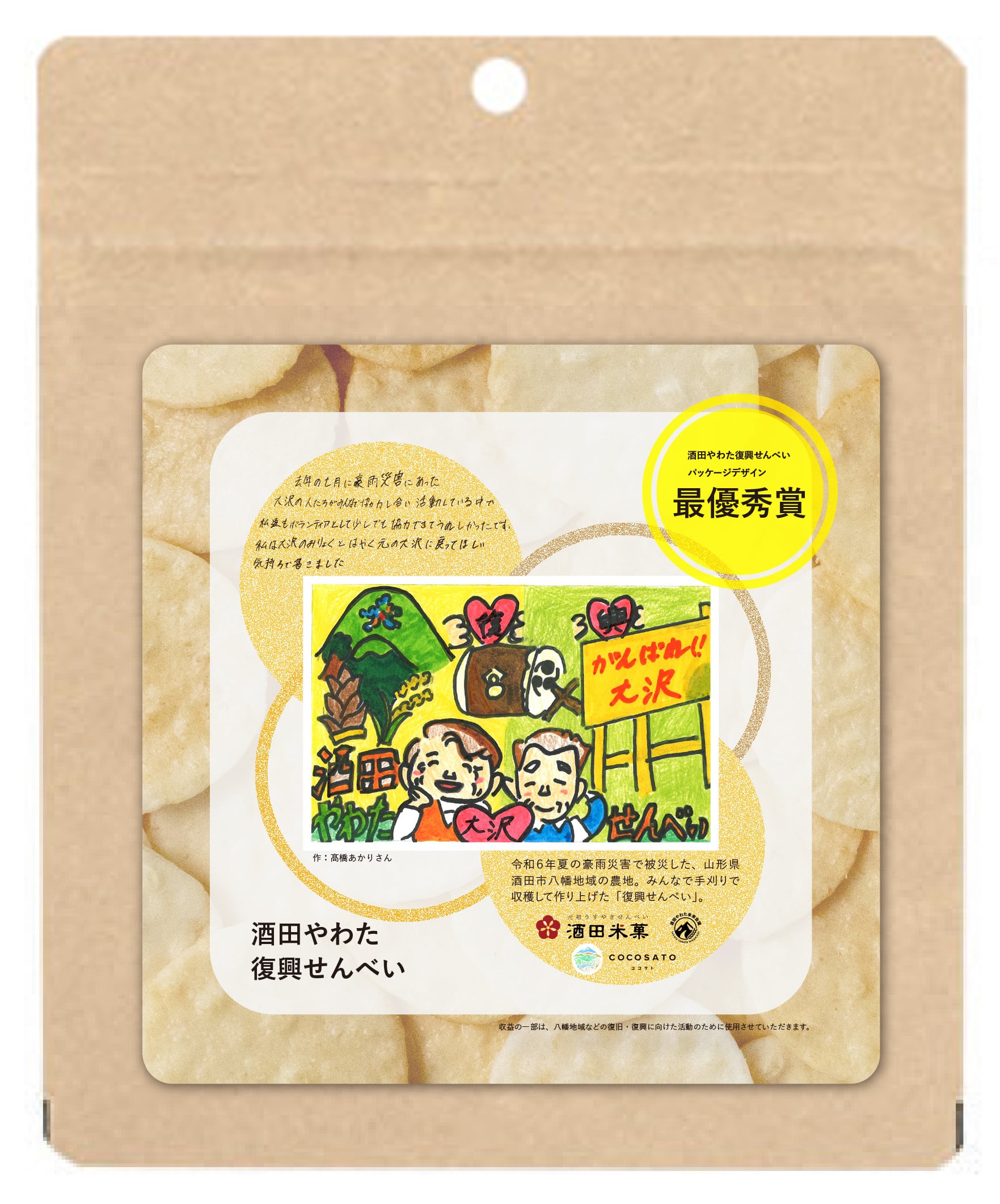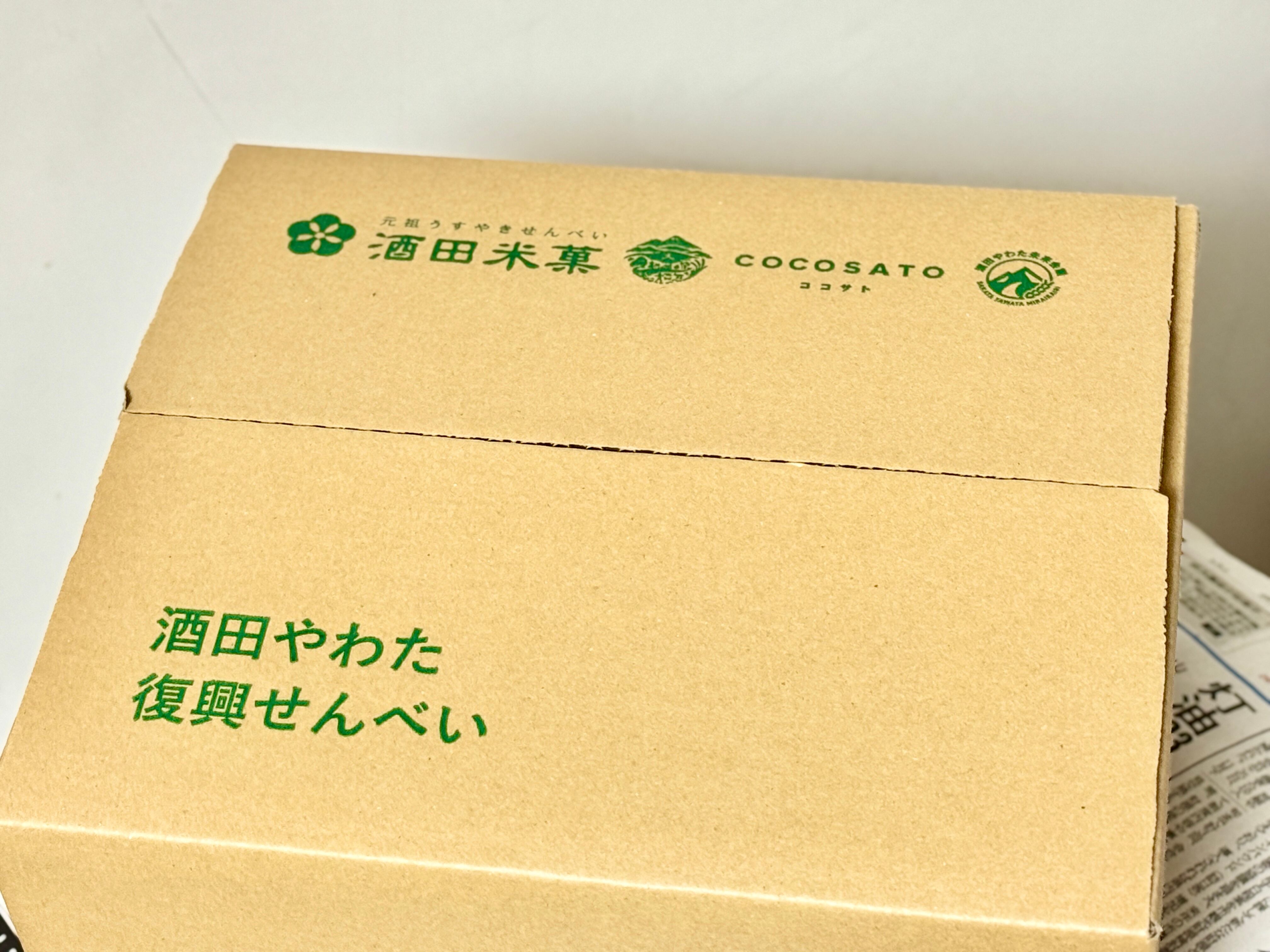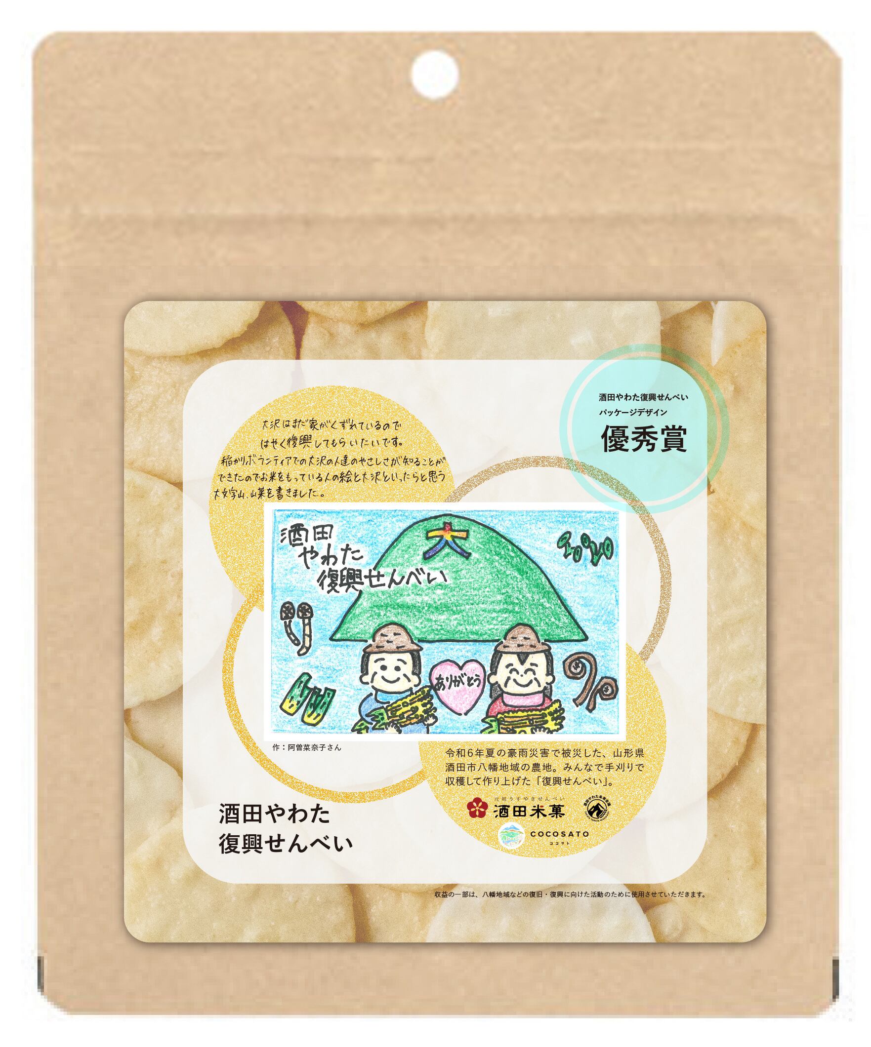 合同会社COCOSATOが企画・販売、酒田米菓株式会社 様が製造、酒田やわた未来会議がデザイン監修をし、開発しました。デザイナーは東北芸術工科大学卒業生の高橋睦丸氏が担当。塩味には、株式会社さかたの塩 様の「さかたの塩×アイアイひらたの塩」のW塩を使用。お米の籾摺りで株式会社アグレスト様にご協力いただきました。