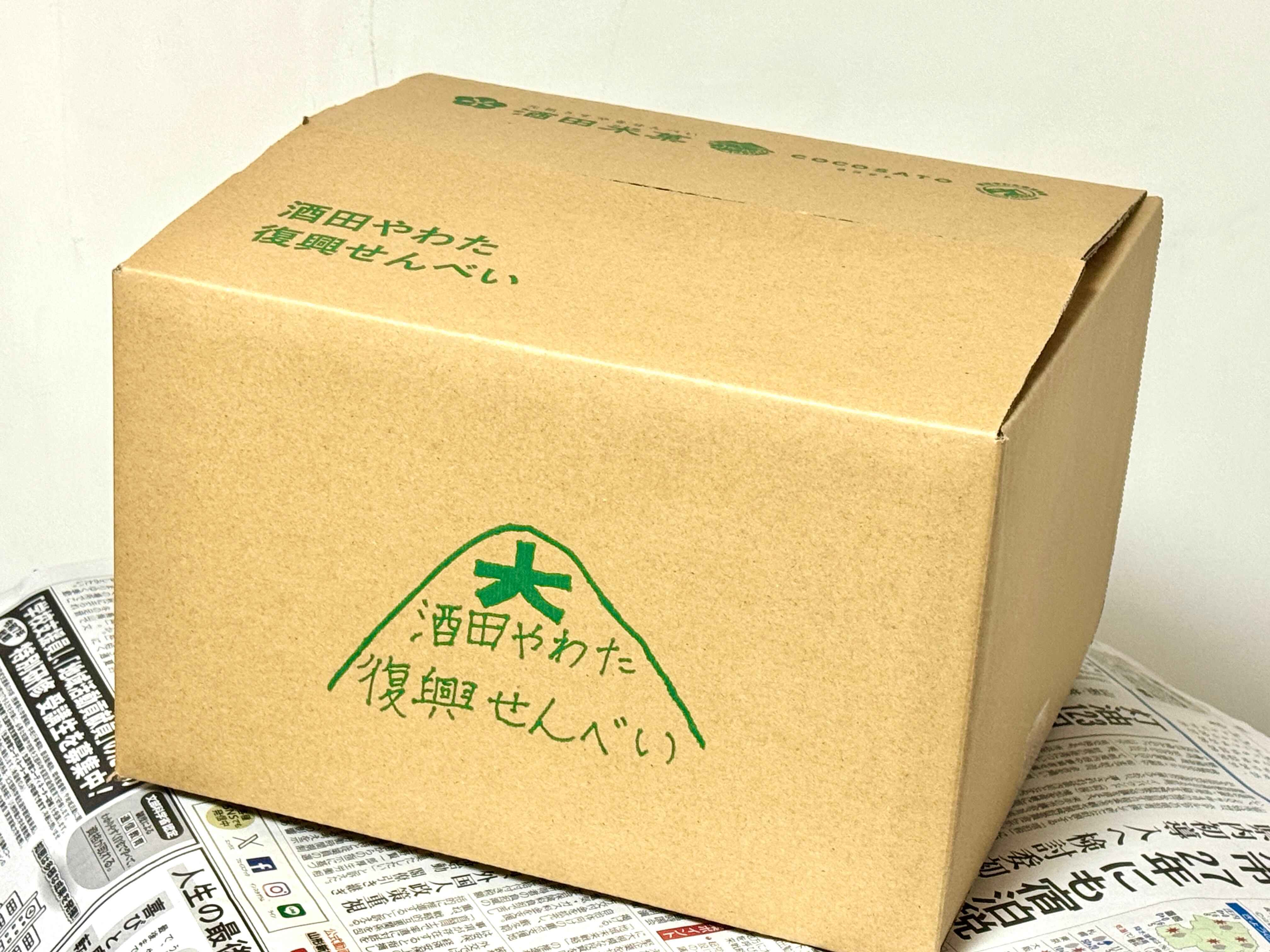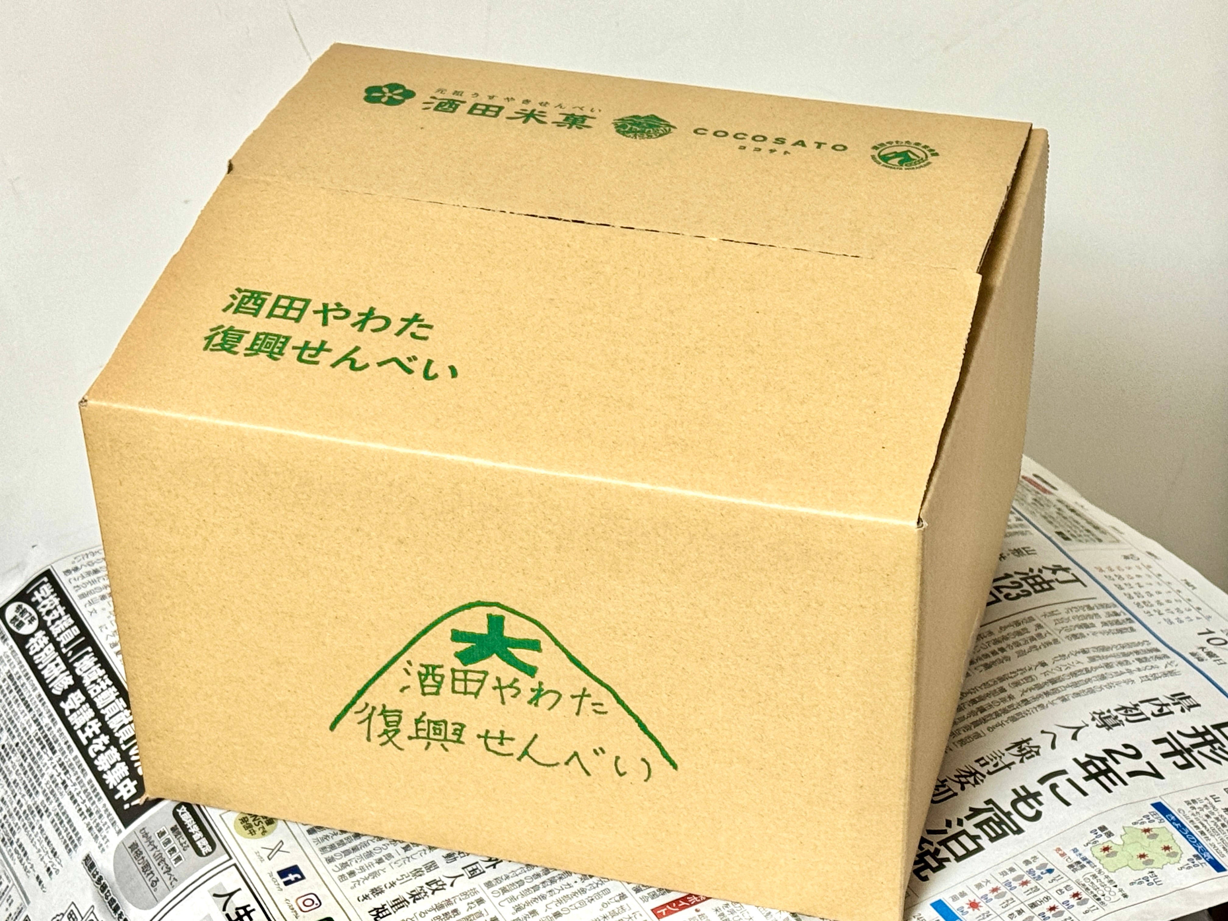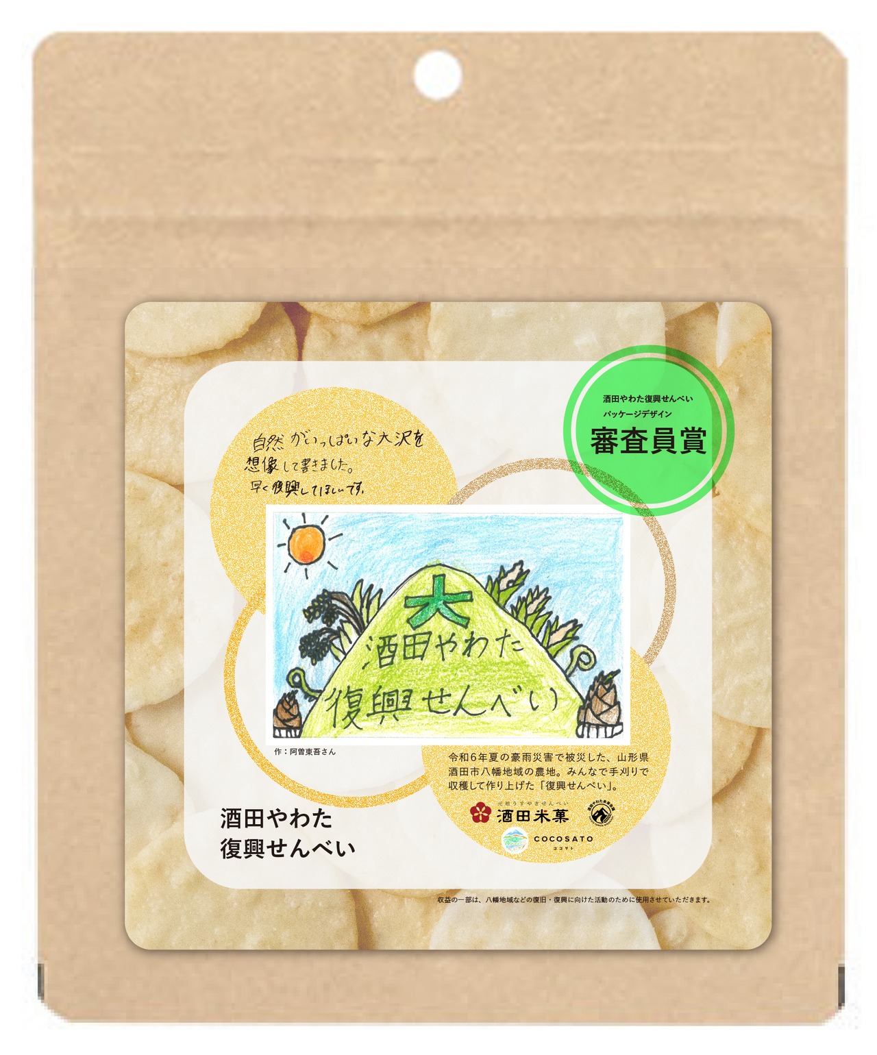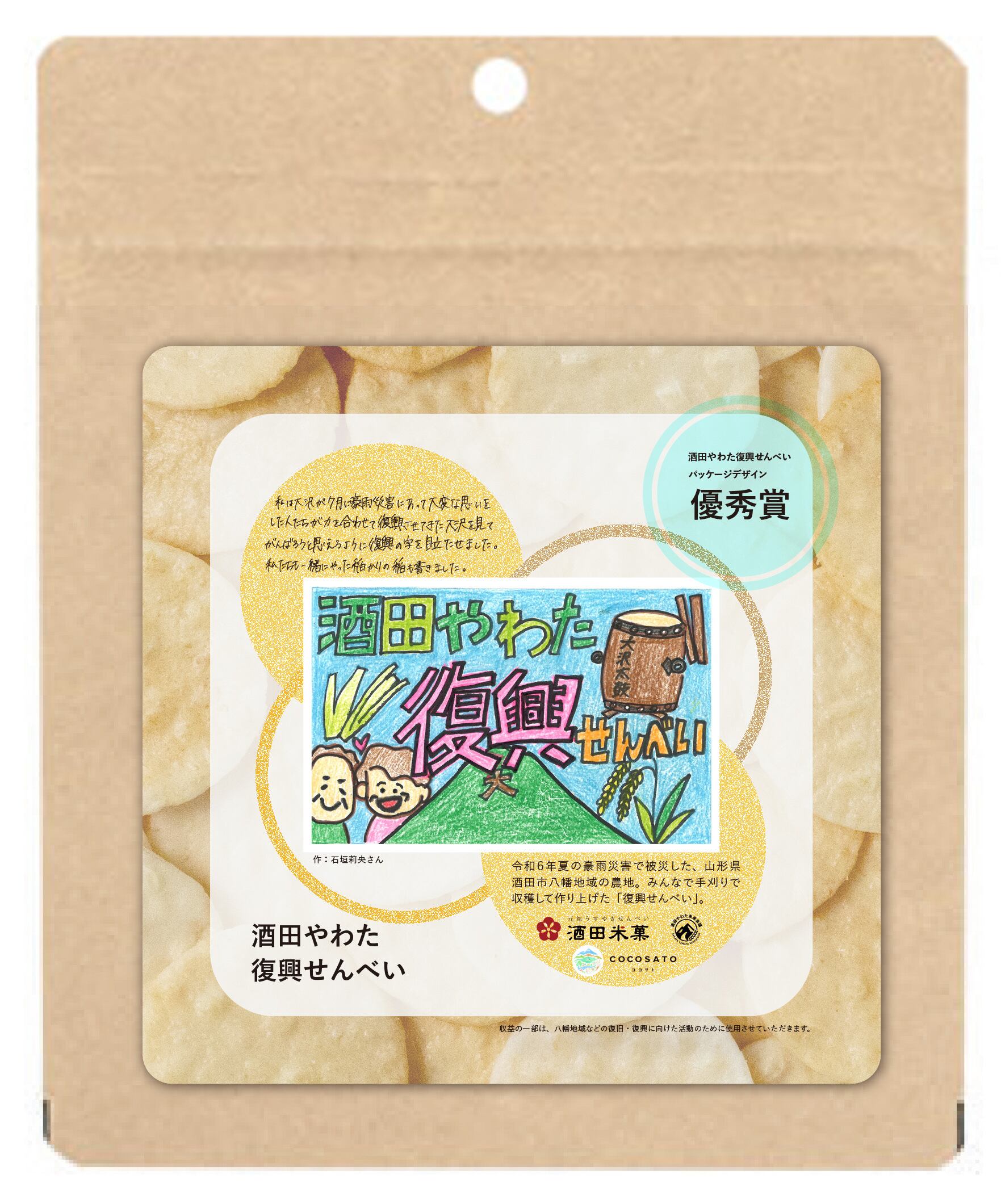 合同会社COCOSATOが企画・販売、酒田米菓株式会社 様が製造、酒田やわた未来会議がデザイン監修をし、開発しました。デザイナーは東北芸術工科大学卒業生の高橋睦丸氏が担当。塩味には、株式会社さかたの塩 様の「さかたの塩×アイアイひらたの塩」のW塩を使用。お米の籾摺りで株式会社アグレスト様にご協力いただきました。