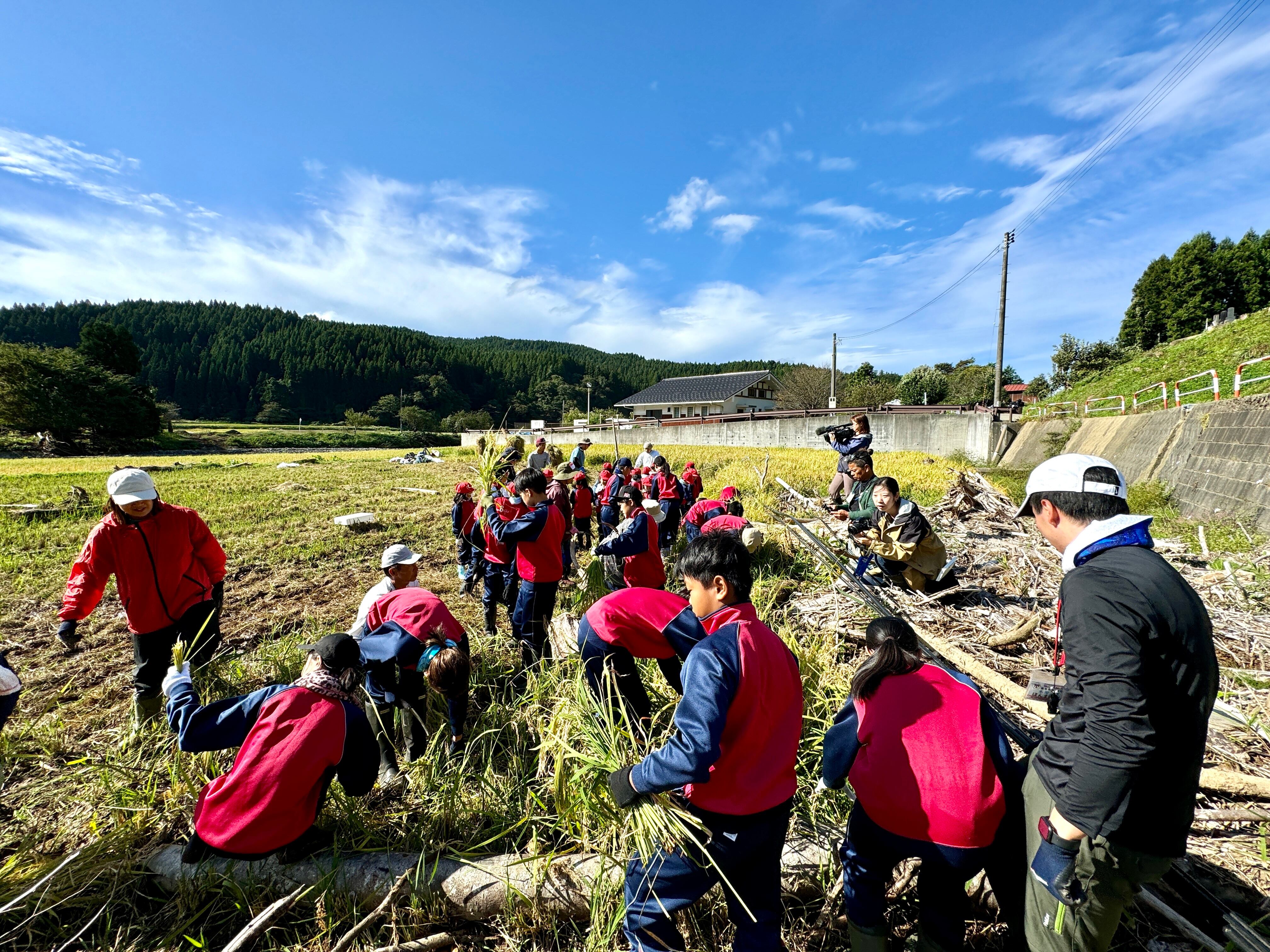 2024年7月の豪雨災害で流木や土砂などが流入してコンバインで稲刈りができない箇所があった山形県酒田市八幡地域 大沢地区の田んぼで、鎌で手刈りの稲刈りボランティアをして収穫したお米を使用し、「酒田やわた復興せんべい」を作りました。