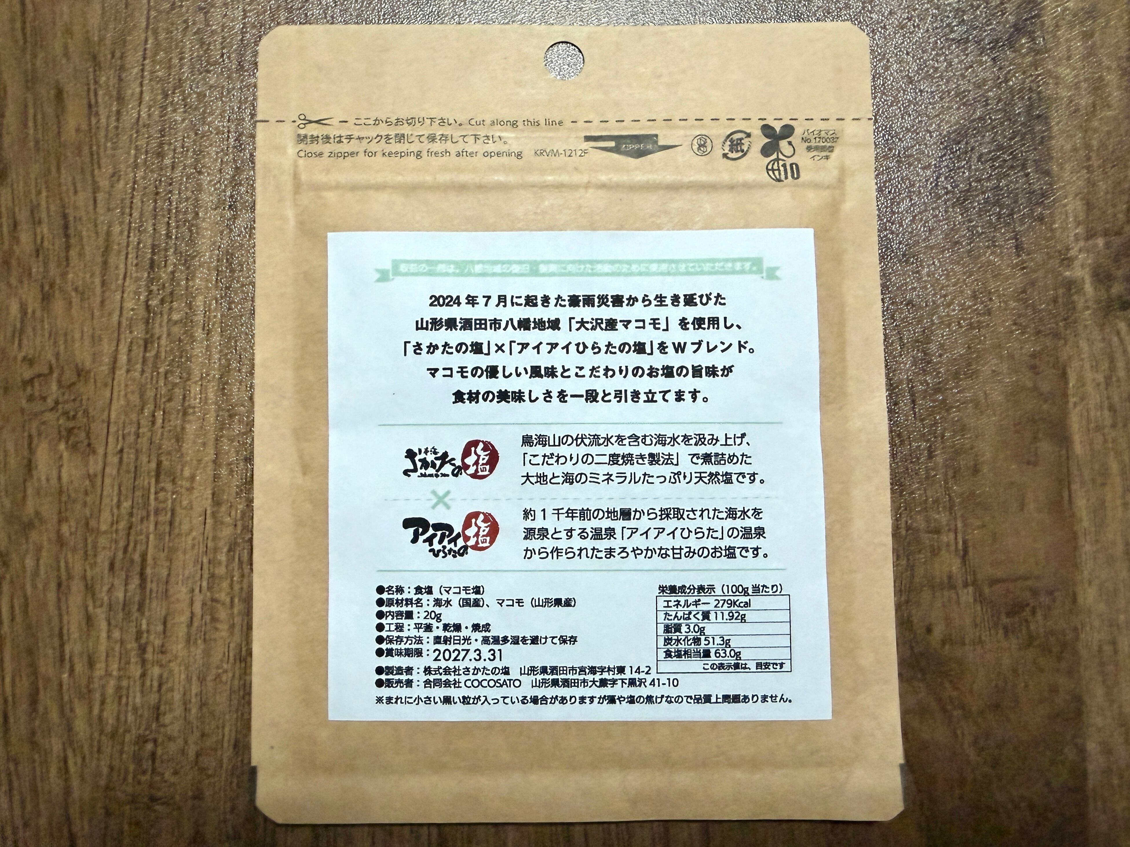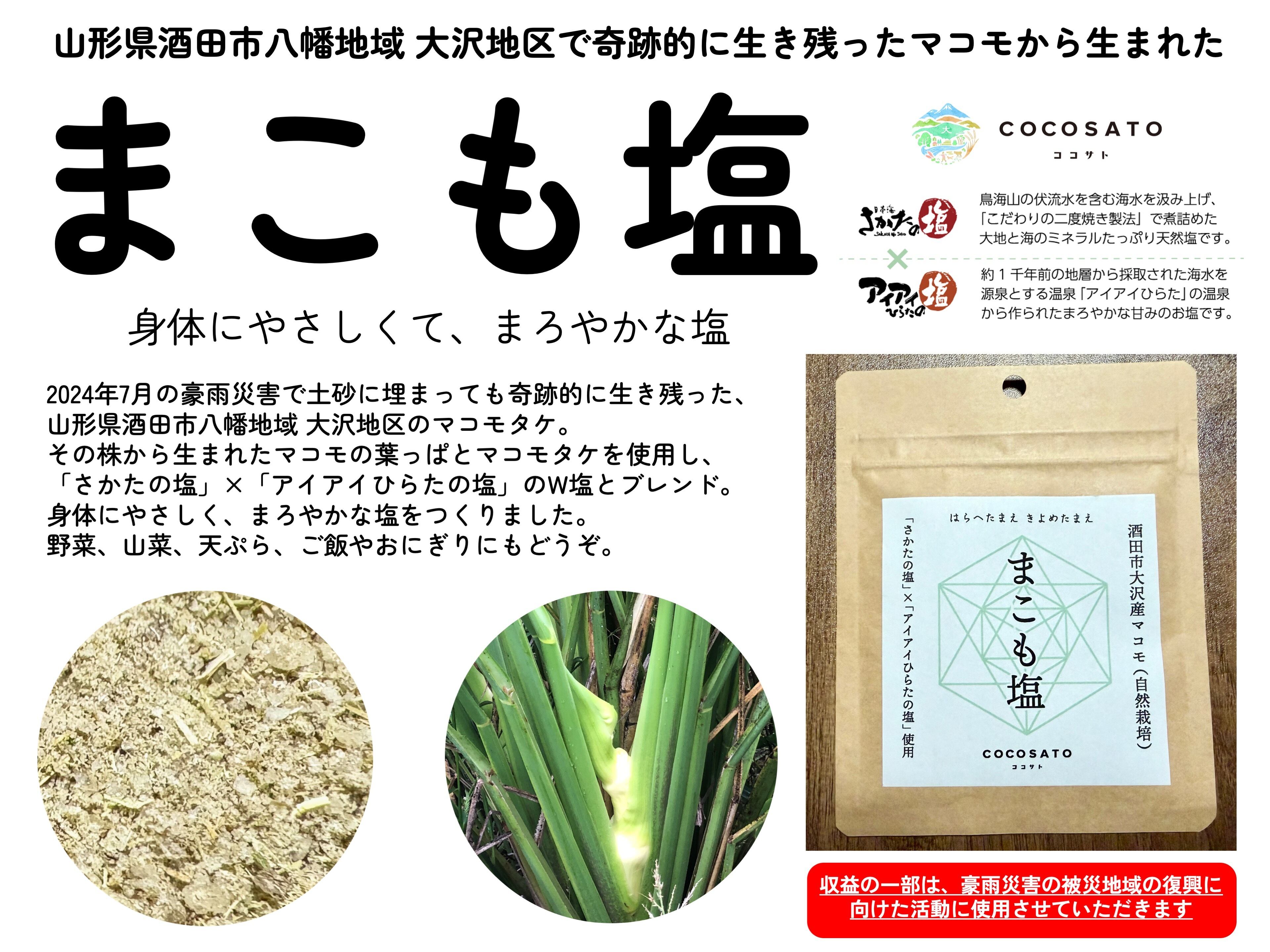 2024年7月の豪雨災害で土砂に埋まっても奇跡的に生き残った、山形県酒田市八幡地域 大沢地区のマコモタケ。その株から生まれたマコモの葉っぱとマコモタケを使用し、「さかたの塩」×「アイアイひらたの塩」のW塩とブレンド。身体にやさしくて、まろやかな塩をつくりました。野菜、山菜、天ぷら、ご飯やおにぎりにもどうぞ。